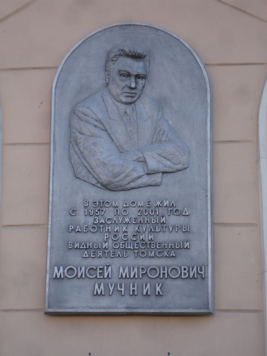 Автор: скульптор Л.Л. Майоров. Барельеф (портрет). Краткий текст«В этом доме жил с 1957 по 2001 год заслуженный деятель культуры России, видный общественный деятель Томска Моисей Миронович Мучник»