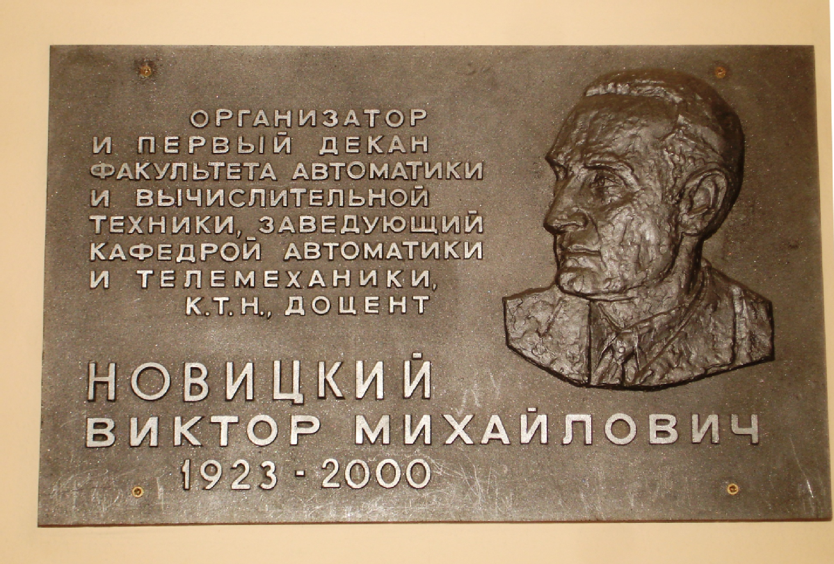 Открыта: 21 мая 2001. Металл, барельеф (портрет).«Организатор и первый декан факультета автоматики и вычислительной техники, заведующий кафедрой автоматики и телемеханики, к.т.н. доцент Новицкий Виктор Михайлович. 1923-2000»