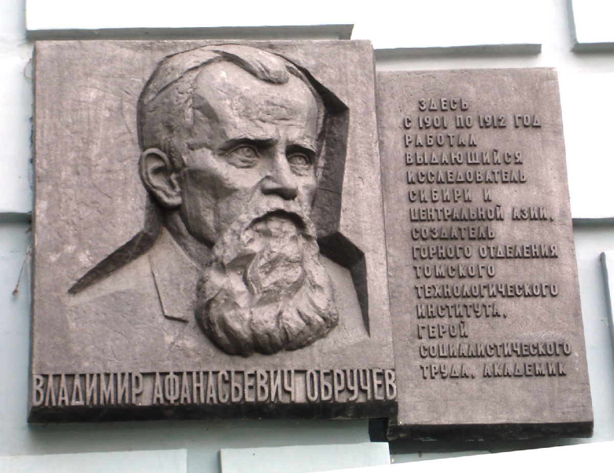«Владимир Афанасьевич Обручев. Здесь с 1901 по 1912 год работал выдающийся исследователь Сибири и Центральной Азии, oснователь горного отделения Томского технологического института, Герой Социалистического Труда, академик Владимир Афанасьевич Обручев»