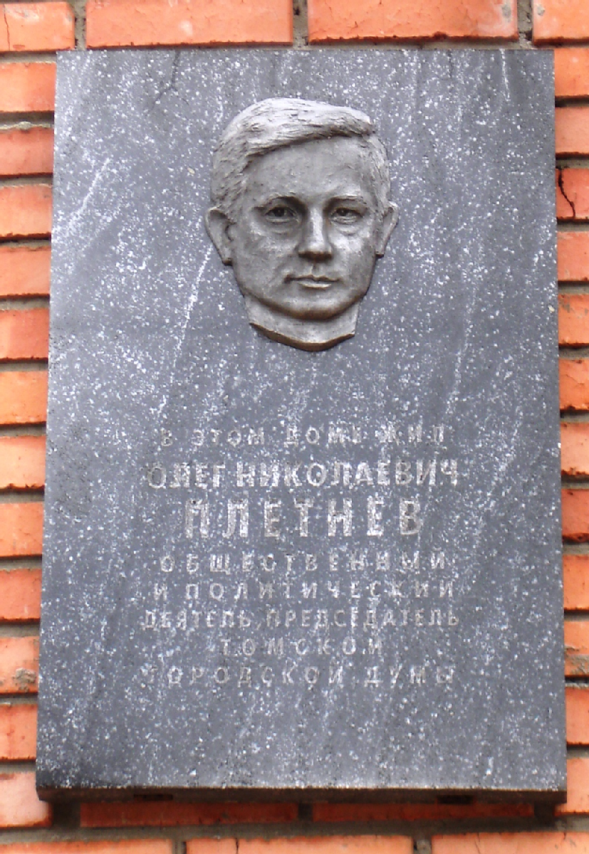 Открыта:15 октября 2003. Гранит, бронза, барельеф (портрет).«В этом доме жил Олег Николаевич Плетнев, общественный и политический деятель, председатель Томской городской думы»