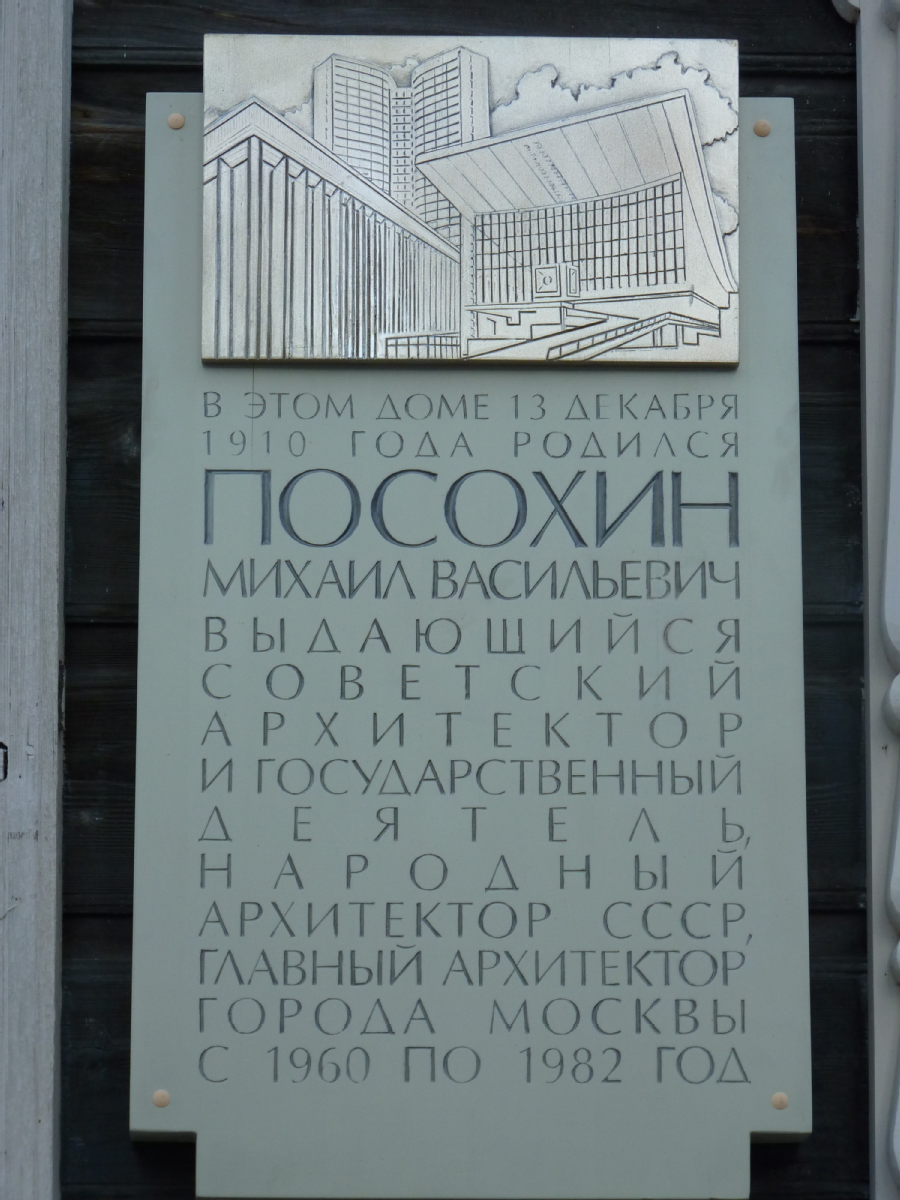 «В этом доме 13 декабря 1910 года родился Посохин Михаил Васильевич, выдающийся советский архитектор и государственный деятель, Народный архитектор СССР, главный архитектор города Москвы с 1960 по 1982 год»