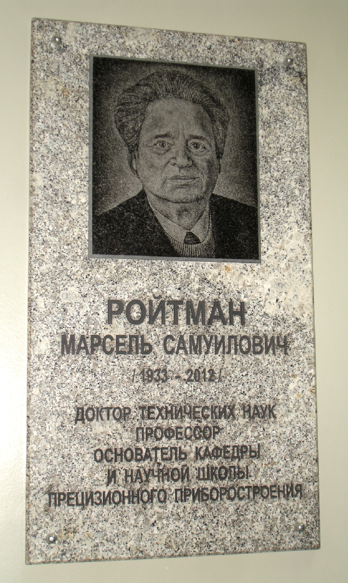 Открыта: Март 2013. Гранит, барельеф (портрет).«Ройтман Марсель Самуилович. 1933-2012. Доктор технических наук, профессор, основатель кафедры и научной школы прецизионного приборостроения»