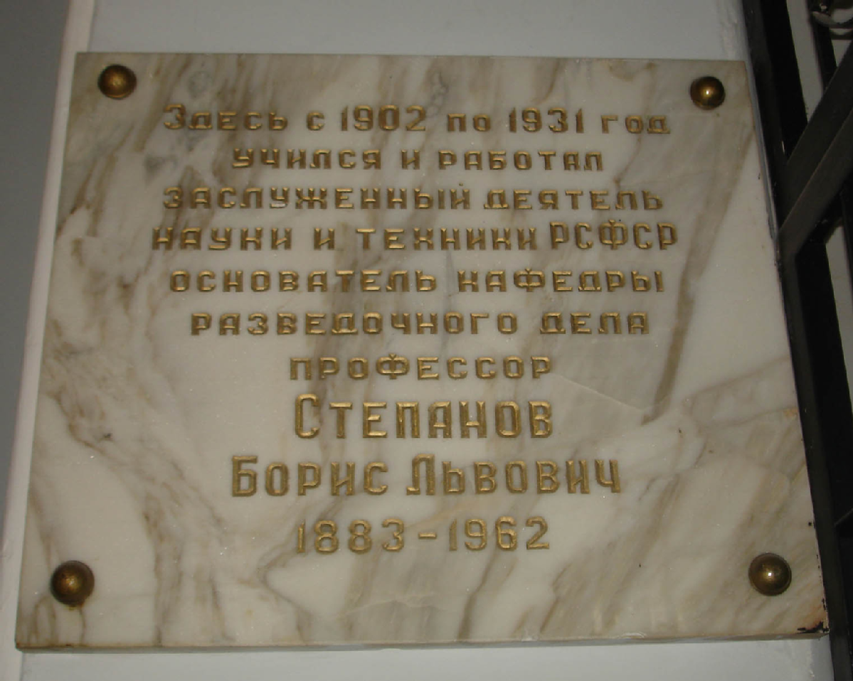 «Здесь с 1902 по 1931 год учился и работал заслуженный деятель науки и техники РСФСР, основатель кафедры разведочного дела, профессор Степанов Борис Львович. 1883-1962»