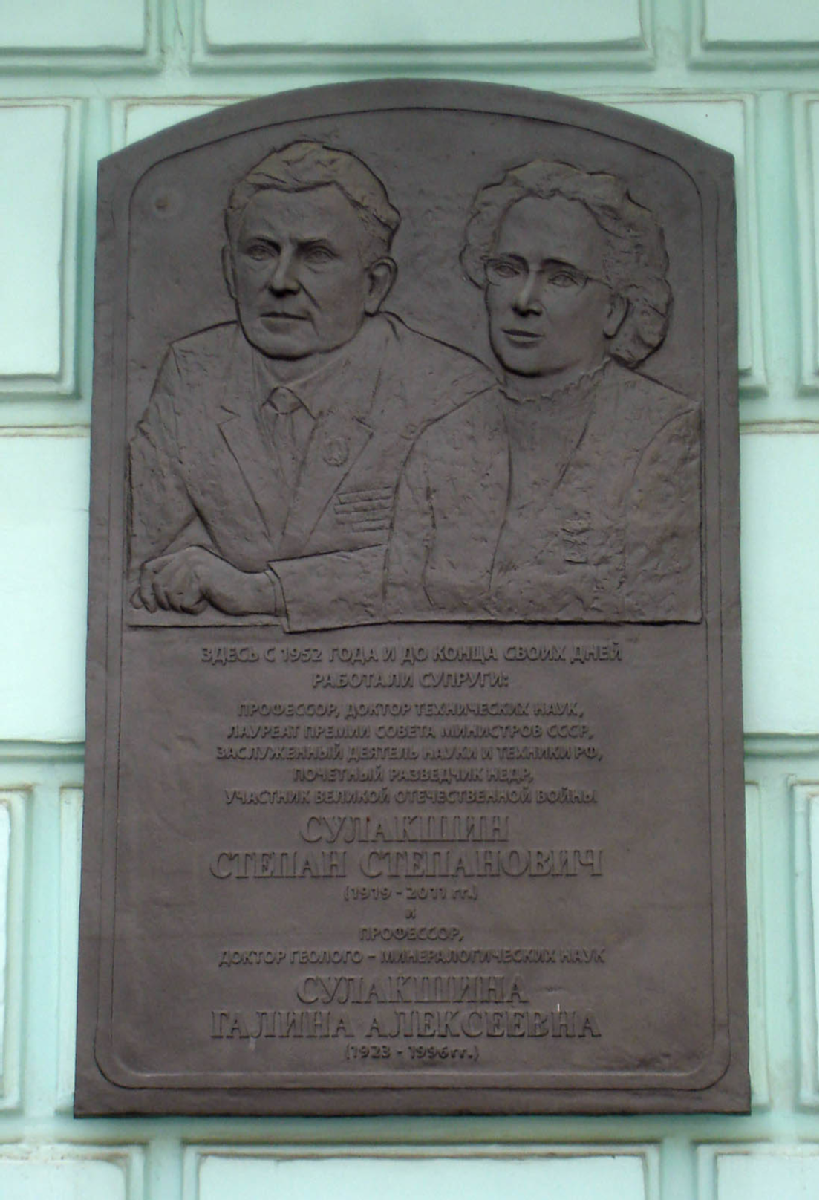 Сулакшиной Г.А., мемориальная доска«Здесь с 1952 года и до конца своих дней работали супруги: профессор, доктор технических наук, лауреат премии Совета Министров СССР, заслуженный деятель науки и техники РФ, почётный разведчик недр, участник Великой Отечественной войны Сулакшин Степан Степанович (1919-2011 гг.) и профессор, доктор геолого-минералогических наук Сулакшина Галина Алексеевна (1923-1996 гг.)»