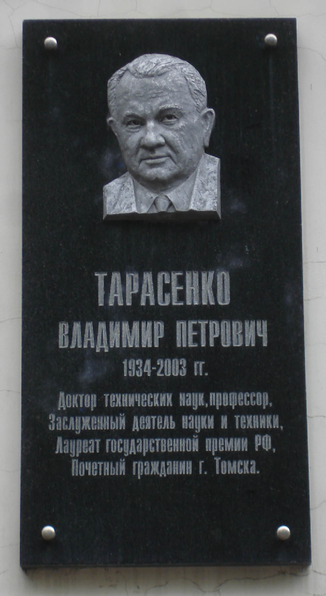 «Тарасенко Владимир Петрович. 1934-2003 гг. Доктор технических наук, профессор, Заслуженный деятель науки и техники, Лауреат Государственной премии РФ, Почётный гражданин г. Томска»