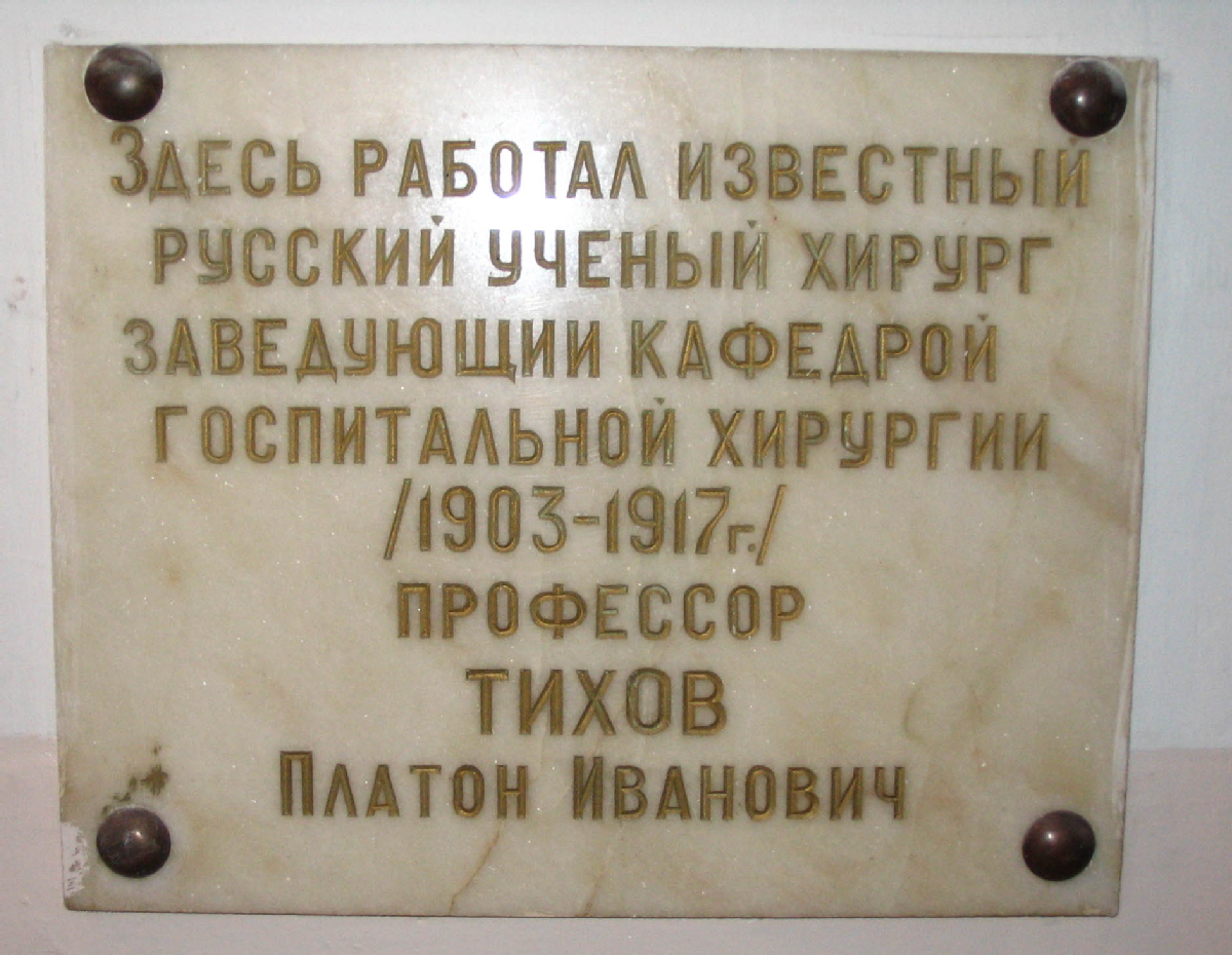 «Здесь работал известный русский ученый хирург, заведующий кафедрой госпитальной хирургии /1903-1917 г./, профессор Тихов Платон Иванович»