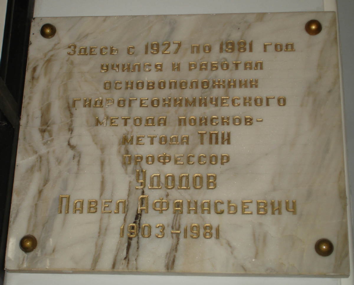 «Здесь с 1927 по 1981 год учился и работал основоположник гидрогеохимического метода поисков - метода ТПИ, профессор Удодов Павел Афанасьевич. 1903-1981»