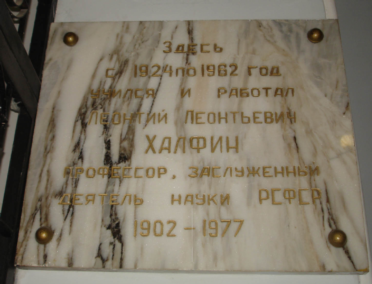 Открыта: Не ранее 1977. Мрамор.«Здесь с 1924 по 1962 год учился и работал Леонтий Леонтьевич Халфин профессор, заслуженный деятель науки РСФСР. 1902-1977»