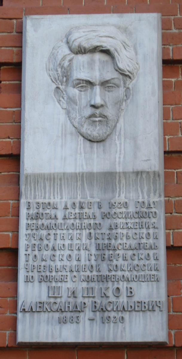 «В этом доме в 1920 году работал деятель российского революционного движения, участник Октябрьской революции, председатель Томской губернской чрезвычайной комиссии по борьбе с контрреволюцией Шишков Александр Васильевич. 1883-1920»