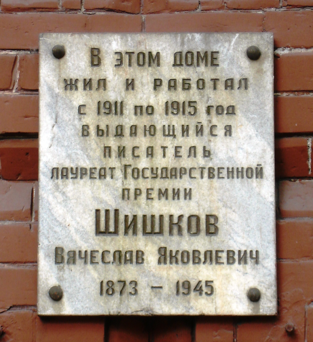 «В этом доме жил и работал с 1911 по 1915 год выдающийся писатель, лауреат Государственной премии Шишков Вячеслав Яковлевич. 1873-1945»