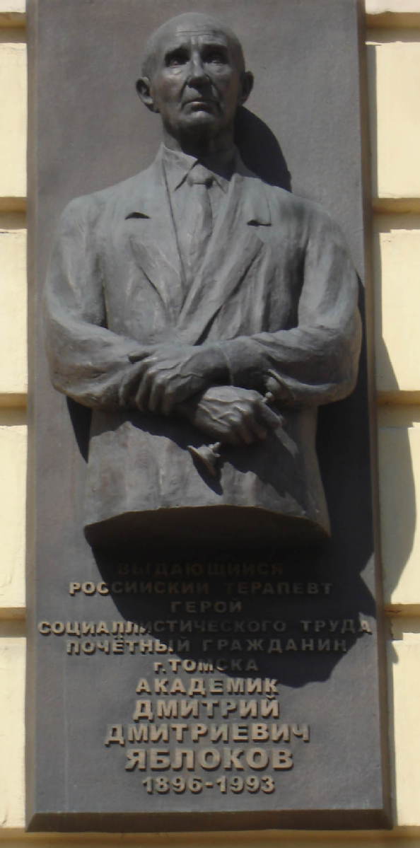 Автор: скульптор Н.П. Гнедых. Бронза, горельеф. Краткий текст«Выдающийся российский терапевт. Герой Социалистического Труда. Почётный гражданин г. Томска. Академик Дмитрий Дмитриевич Яблоков. 1896-1993»