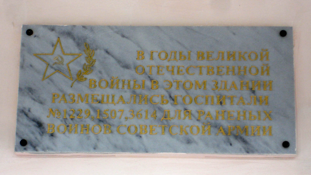 «В годы Великой Отечественной войны в этом здании размещались госпитали № 1229, 1507, 3614 для раненых воинов Советской Армии»