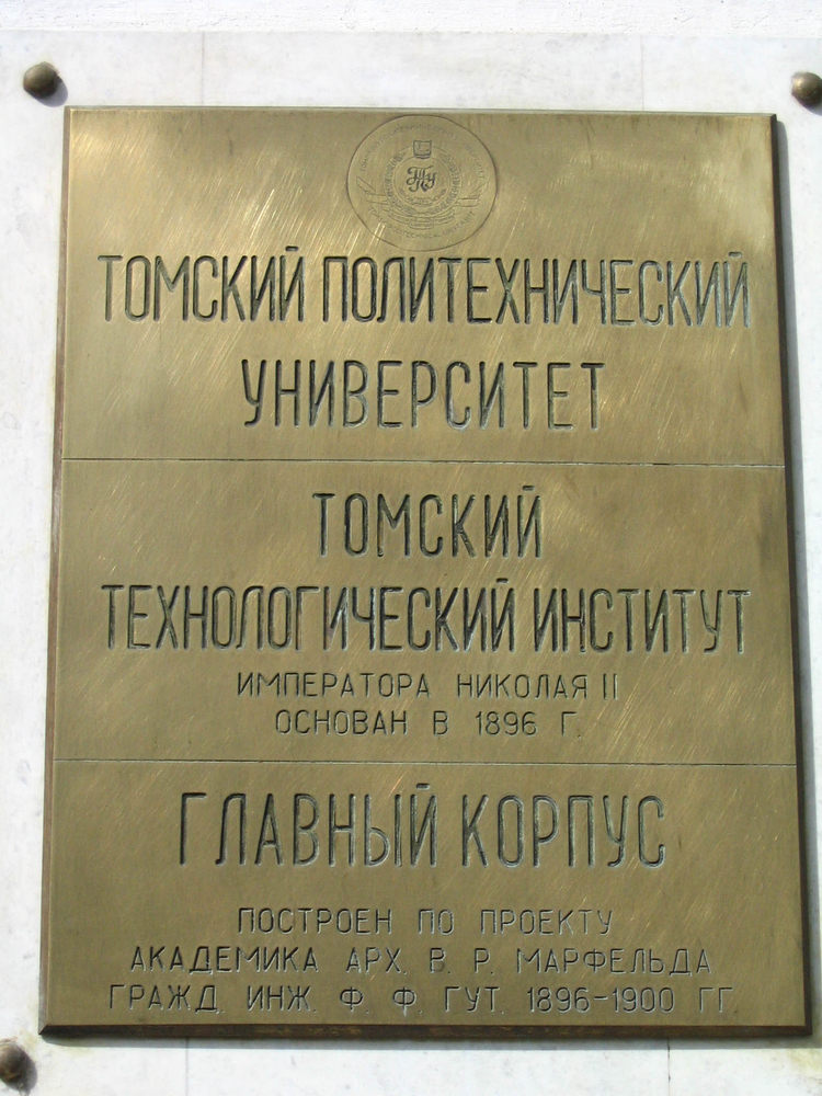 «Томский политехнический университет. Томский технологический институт Императора Николая II. Основан в 1896 г. Главный корпус. Построен по проекту академика арх. Р.Р. Марфельда гражд. инж. Ф.Ф. Гут 1896-1900 гг.»