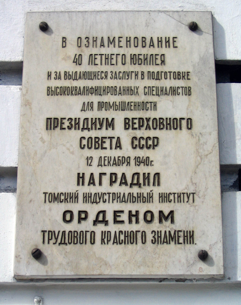 «В ознаменование 40-летнего юбилея и за выдающиеся заслуги в подготовке высококвалифицированных специалистов для промышленности Президиум Верховного Совета СССР 12 декабря 1940 г. наградил Томский индустриальный институт орденом Трудового Красного Знамени». Мрамор.