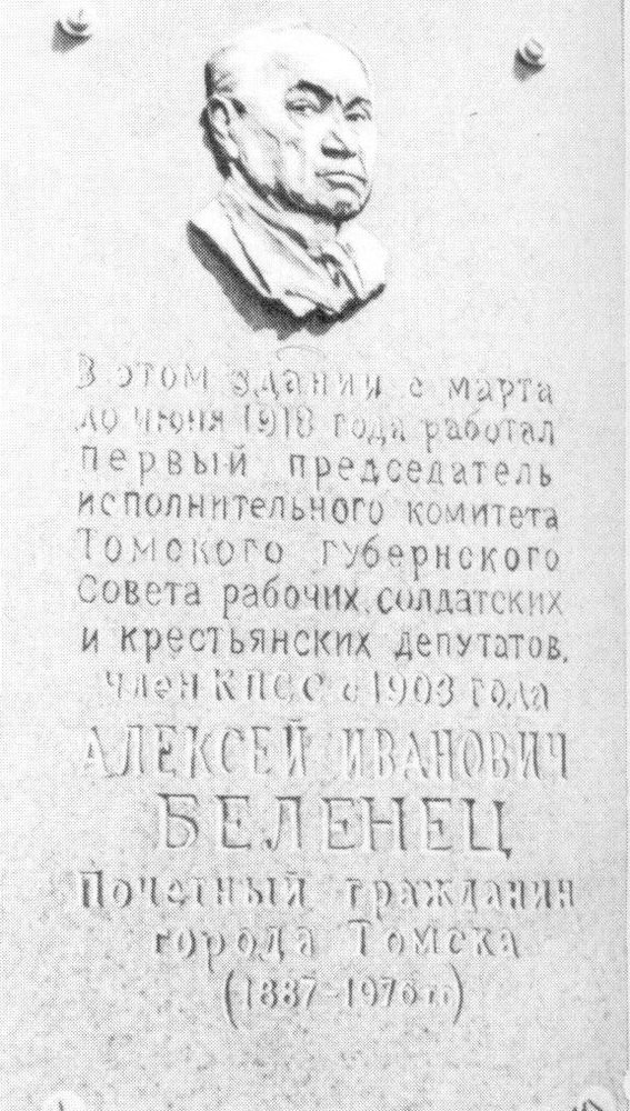 «В этом здании с марта до июня 1918 года работал первый председатель исполнительного комитета Томского губернского Совета рабочих, солдатских и крестьянских депутатов, член КПСС с 1903 года Алексей Иванович Беленец. Почётный гражданин города Томска (1887-1976 гг.)»
