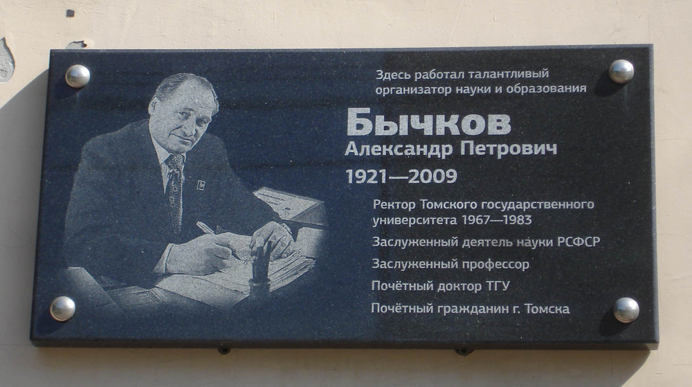 «Здесь работал талантливый организатор науки и образования Бычков Александр Петрович. 1921-2009. Ректор Томского государственного университета, 1967-1983. Заслуженный деятель науки РСФСР, Заслуженный профессор, Почётный доктор ТГУ, Почётный гражданин г. Томска»